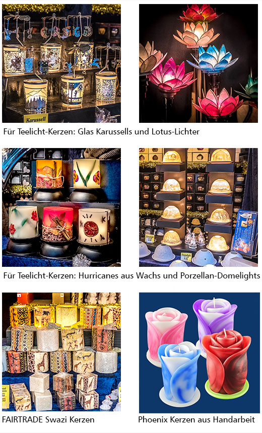 Neben der Lotuskerze bieten wir auf unseren Weihnachtsmärkten zahlreiche andere Kerzen an. In einer Hütte sind manchmal bis zu einer Tonne Kerzen gelagert. In grossen Kerzen-Ständen überschreitet das Sortiment oft die Zahl von 800 Artikeln!