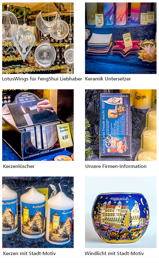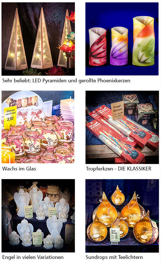 Neben der Lotuskerze bieten wir auf unseren Weihnachtsmärkten zahlreiche andere Kerzen an. In einer Hütte sind manchmal bis zu einer Tonne Kerzen gelagert. In grossen Kerzen-Ständen überschreitet das Sortiment oft die Zahl von 800 Artikeln!